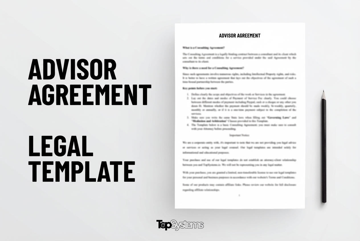 This professional Advisor Agreement template provides a comprehensive legal framework for Advisor arrangements. Designed for businesses and individuals, this template ensures compliance with applicable laws while protecting your interests.